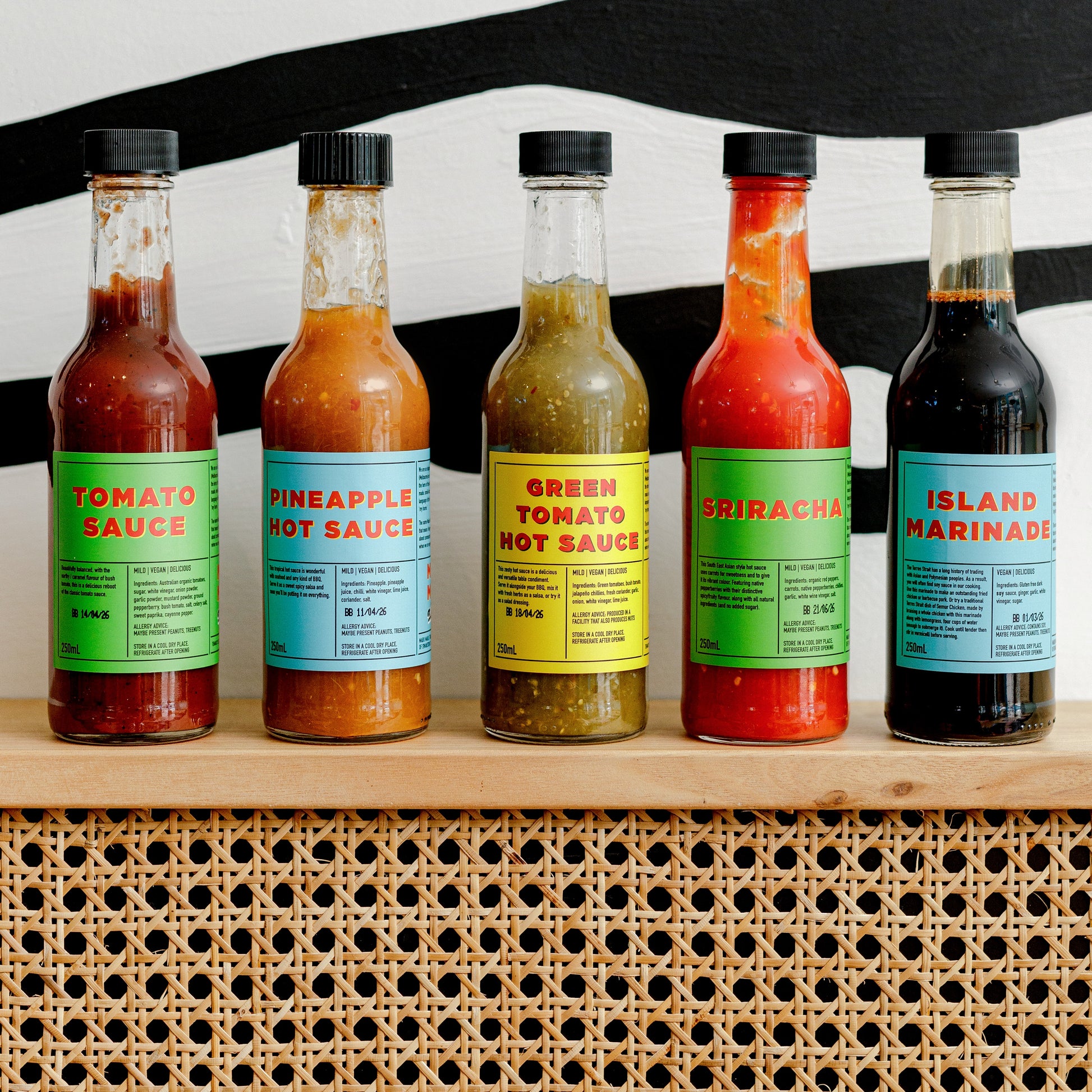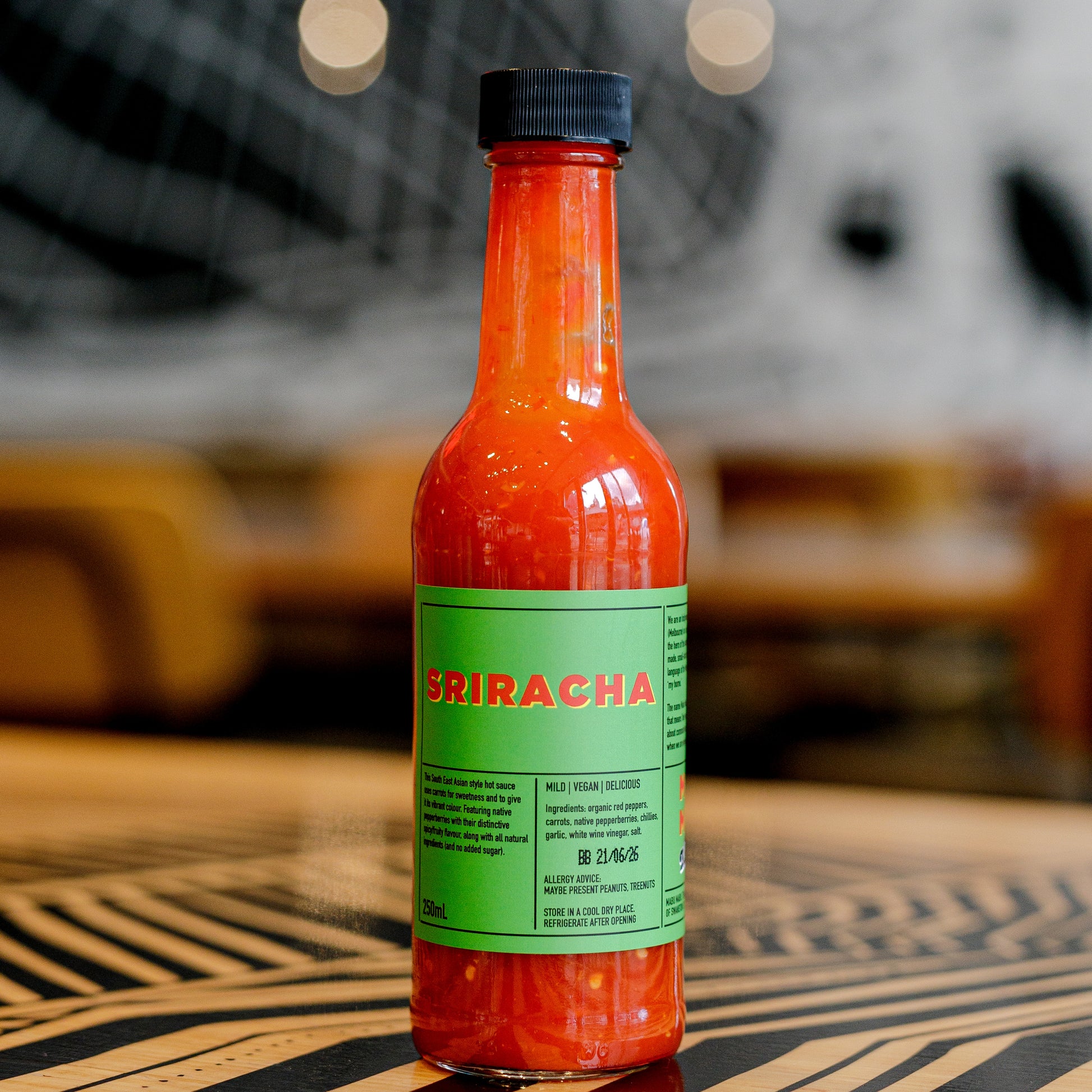 - Sriracha - A south-east Asian style hot sauce with a mild heat. Perfect for those who love to add a dash of chilli to every meal (organic red peppers, carrots, native pepperberries, chillies, garlic, white wine vinegar, salt).